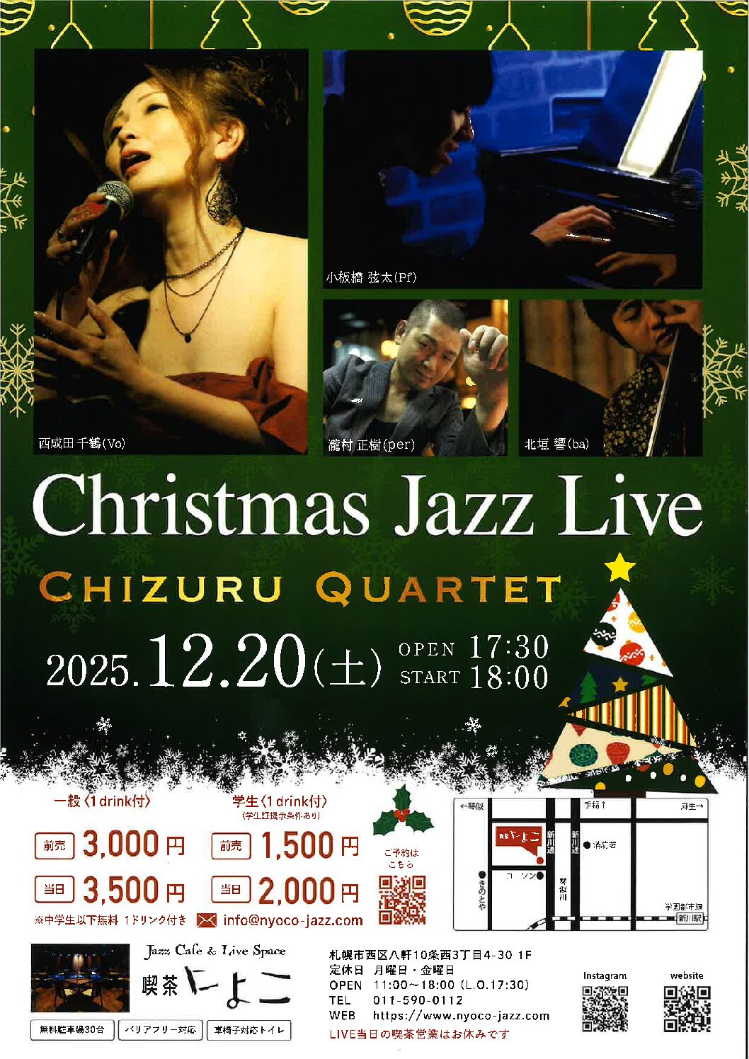 ●日時 12月20日(土)OPEN 17:30 / START 18:00~ ●料金 ・一般(1drink付):予約 3,000円 当日3,500円 ・学生(1drink付):予約 1,500 円 当日2,000円