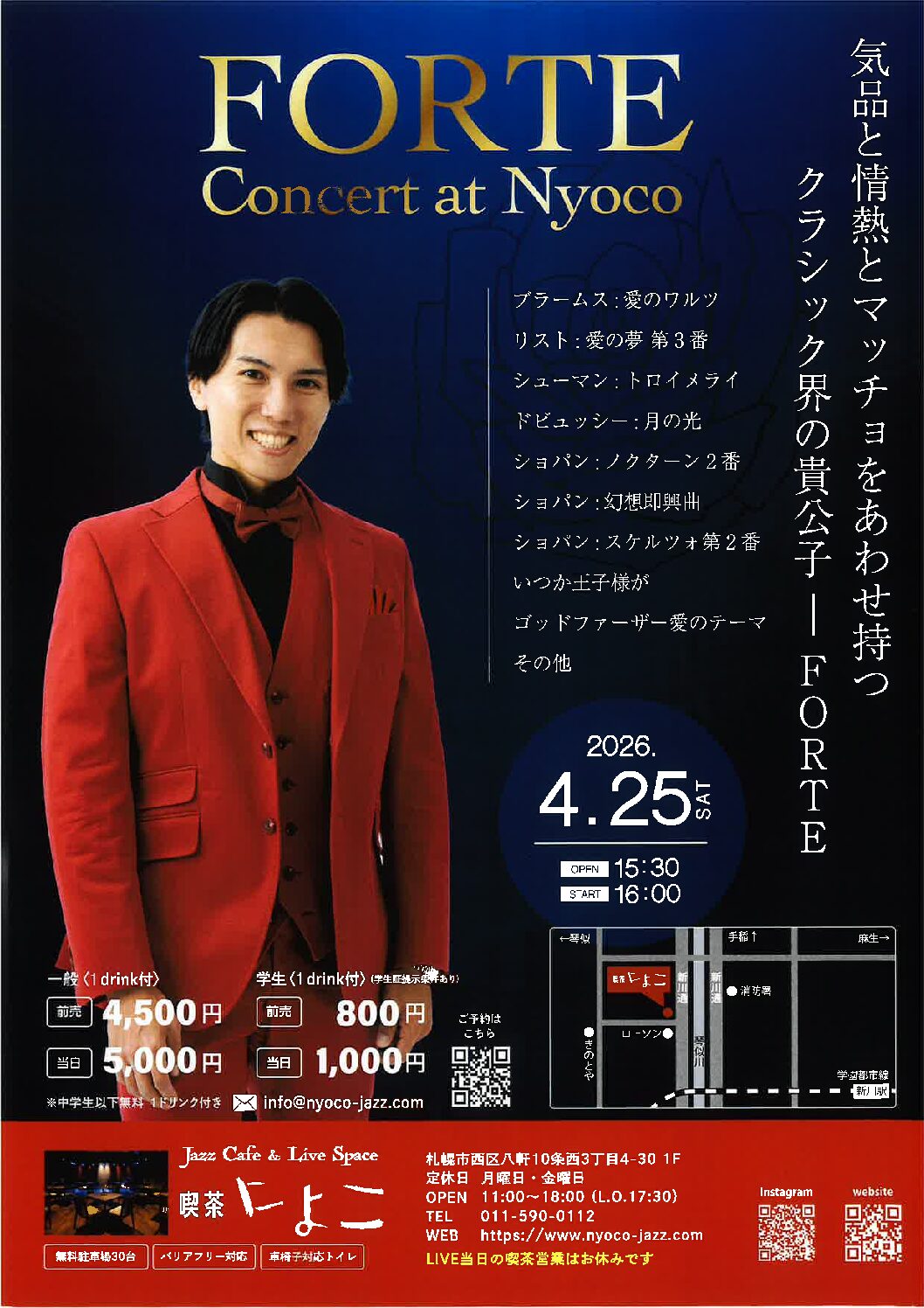 ●日時 2026年4月25日(土)OPEN 15:30 / START 16:00~ ●料金 ・一般(1drink付):予約4,500円 当日5,000円 ・学生(1drink付):予約 800 円 当日1,000円