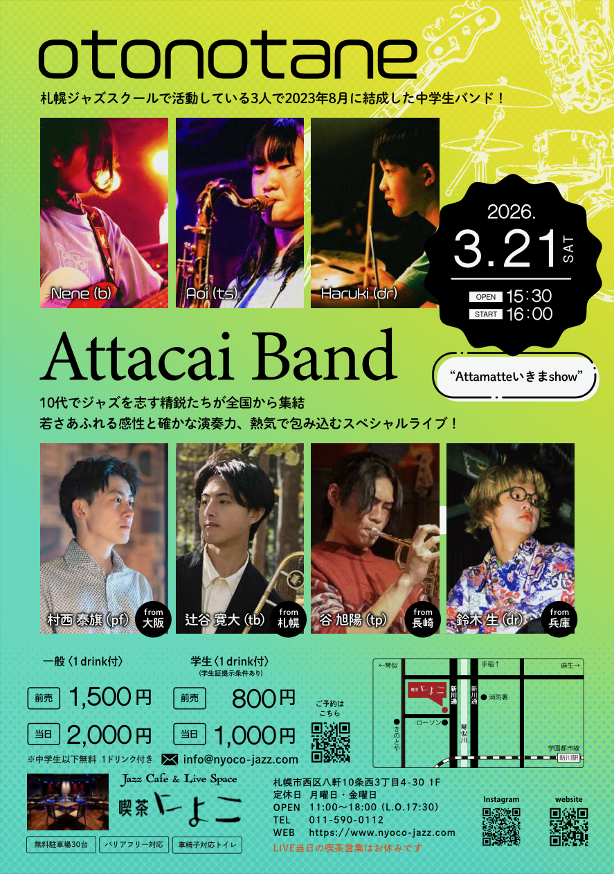 ●日時 2026年3月21日(土)OPEN 15:30 / START 16:00~ ●料金 ・一般(1drink付):予約1,500円 当日2,000円 ・学生(1drink付):予約 800 円 当日1,000円